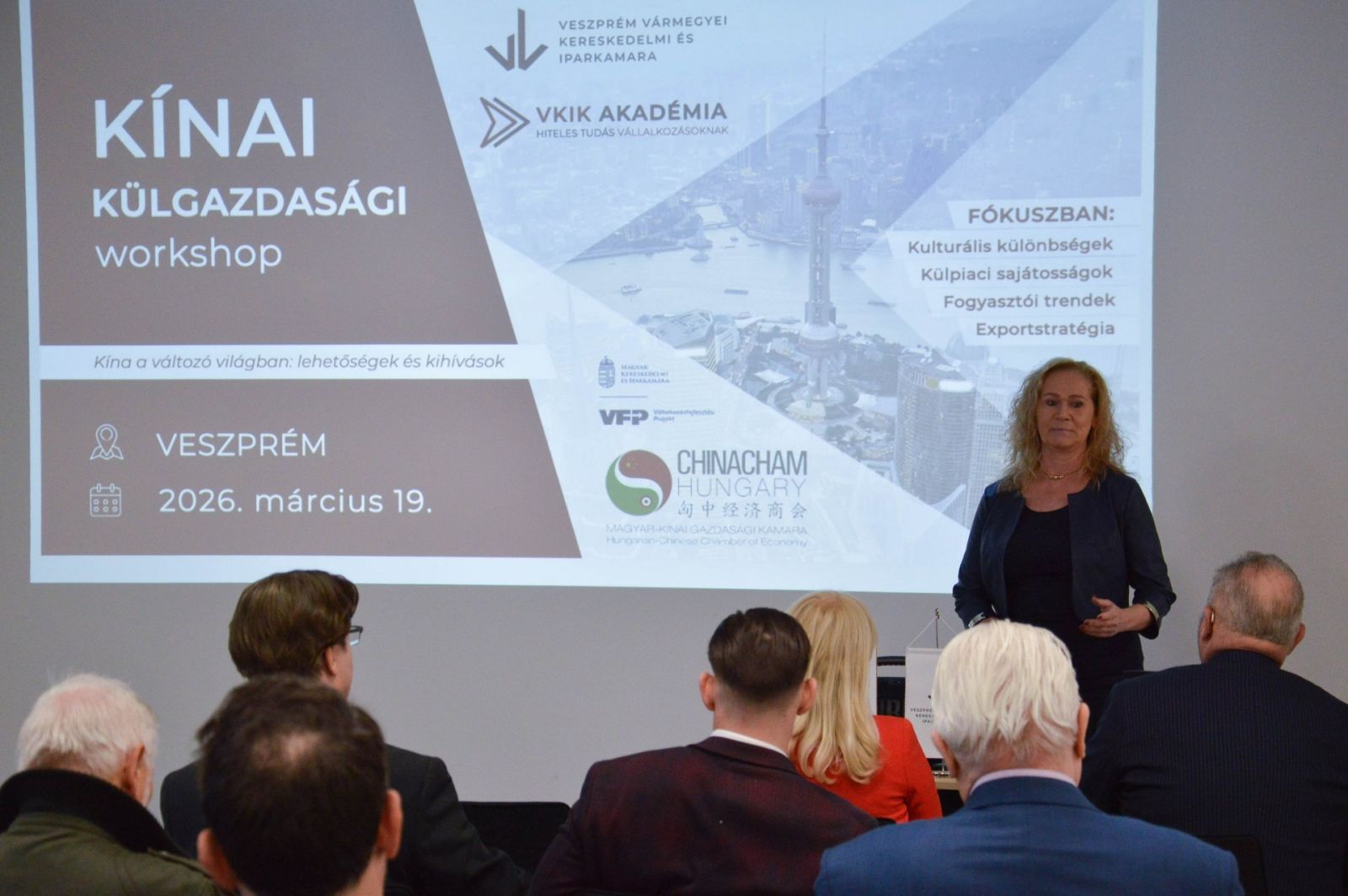 Dr. Somogyi Istvánné, a Veszprém Vármegyei Kereskedelmi és Iparkamara főtitkára köszöntötte a résztvevőket és az előadókat a rendezvényen, mely lehetőséget kínált a térség vállalkozásainak a nemzetközi – ezen belül kiemelten a kínai – piacokon való megjelenéshez, mivel a globális gazdaságban egyre inkább felértékelődik az exportképesség szerepe.