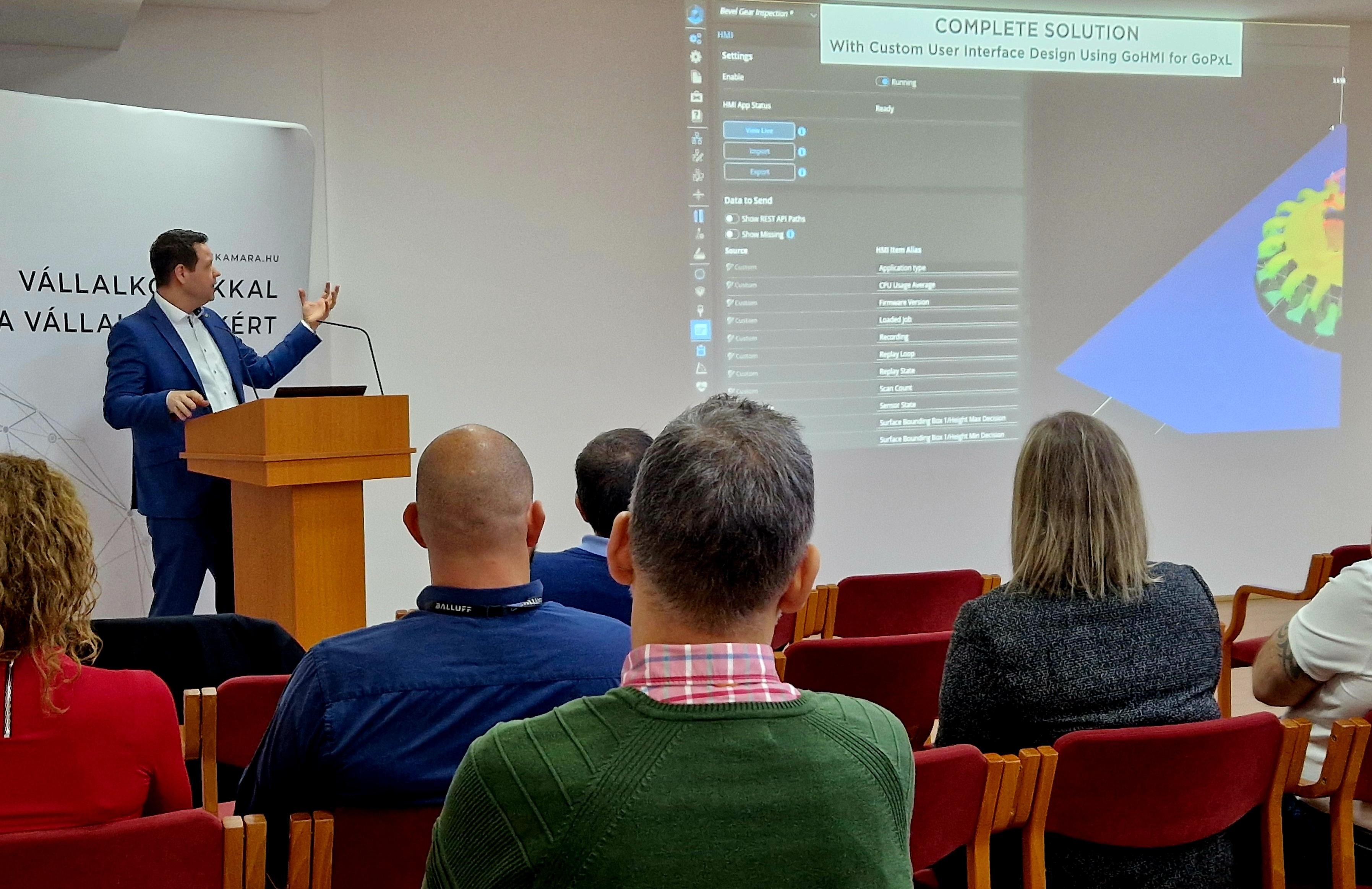 Estók Tibor, Turck Hungary Kft. ügyvezetője előadásában a gépi látás AI-alapú alkalmazásait ismertette ipari környezetben. Bemutatta a szabályalapú és az AI-alapú rendszerek közötti különbségeket, kiemelve azok előnyeit és korlátait. Elmondta, hogy a hagyományos rendszerek gyorsak, de rugalmatlanok, míg az AI képes alkalmazkodni a változó környezethez. Ismertette a mélytanulás szerepét és a „fekete doboz” jellegű működés kihívásait. Kitért a tanítási módokra, például a felhőben és edge eszközökön történő tanulásra.
