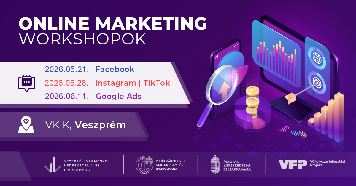 A Veszprém Vármegyei Kereskedelmi és Iparkamara a Fejér Vármegyei Kereskedelmi és Iparkamarával együttmüködésében 3 alkalmas Online marketing workshop-sorozatot szervez, amelynek célja, hogy segítséget nyújtson a vállalkozások – kiemelten az egyéni, mikro- és kisvállalkozások – számára online marketing szakmai területen.