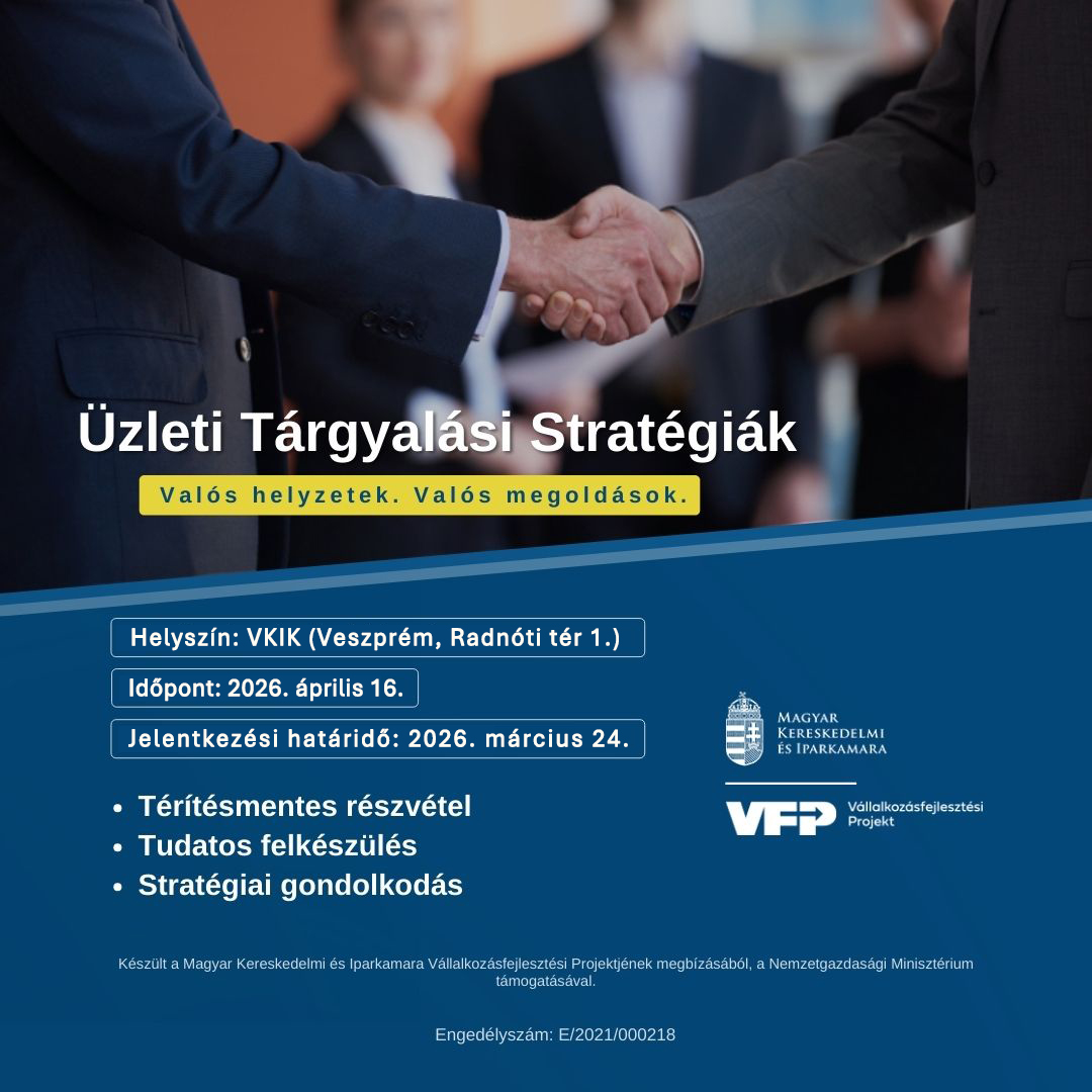 A Magyar Kereskedelmi és Iparkamara a Veszprém Vármegyei Kereskedelmi és Iparkamarával együttműködésben "Üzleti tárgyalási stratégiák" címmel képzést szervez mikro-, kis- és középvállalkozások, vállalatok képviselői részére.