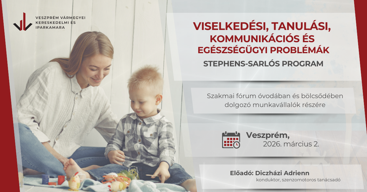A Veszprém Vármegyei Kereskedelmi és Iparkamara óvodában és bölcsődében dolgozó munkavállalók részére szakmai fórumot szervez Viselkedési, tanulási, kommunikációs, egészségügyi problémák és a “Stephens-Sarlós Program” címmel.