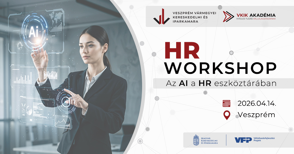 A Veszprém Vármegyei Kereskedelmi és Iparkamara tájékoztató HR workshopot szervez "Az AI a HR eszköztárában – amit már ma érdemes kipróbálni" címmel vállalkozásvezetők, HR vezetők, valamint HR munkatársak részére.